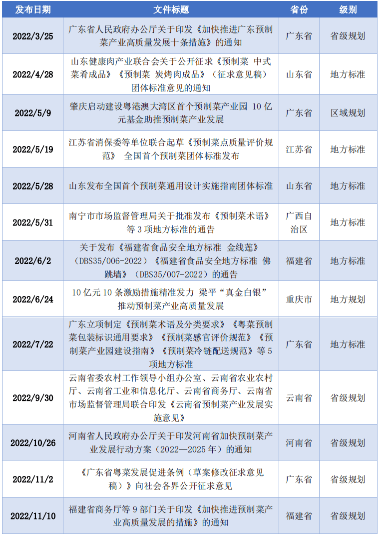 近年来,广东省全链条结构预制菜,组织化、系统化推广预制菜财产。2022年3月,广东出台国内首个省级预制菜财产政策《关于加速推进广东预制菜财产高质量成长十条办法》。办法涵盖强大预制菜财产集群、培育预制菜示范企业、扶植预制菜结合研发平台、鞭策预制菜仓储冷链物流扶植、拓宽预制菜品牌营销渠道、加大财务金融安全支撑力度和扶植广东预制菜文化科普高地等方面,为鞭策广东预制菜财产高质量成长供给政策支持。