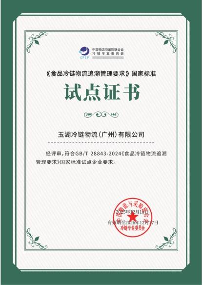 近日,冷链物风行业传来沉磅动静。玉湖冷链广州园区凭仗其正在全程通明化办理取数智化立异方面的杰出表示,成功获评为GB/T 28843-2024《食物冷链物流逃溯办理要求》国度尺度试点单元。这一认证,是对企业运营办理程度的国度级背书,更是对玉湖集团正在冷链物流范畴深耕尺度化扶植焦点能力的权势巨子必定。